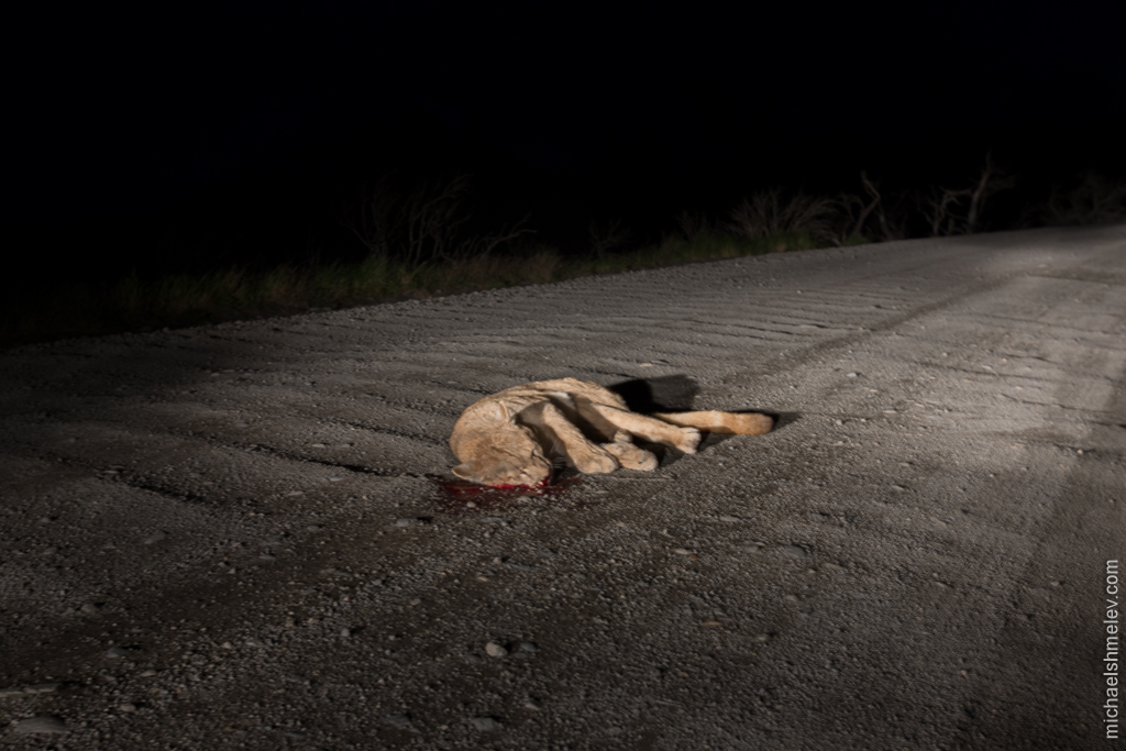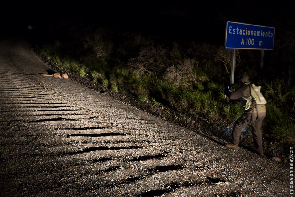 Щебеночный грейдер, в основном пролегая вдоль кромки воды, изредка уходит на небольшие серпантины. На одном из них я внезапно увидел в свете фар крупный объект, лежащий на дороге. Издалека мне показалось, что это скатившийся со склона большой валун, но подъехав ближе, я понял, что это была пума. Она лежала посреди дороги в крови, но еще дышала и пыталась двинуться. Видимо она была совсем недавно сбита одним из автомобилей. Однако, я не видел встречных машин, значит, виновником ДТП был автомобиль, проехавший в попутном со мной направлении.