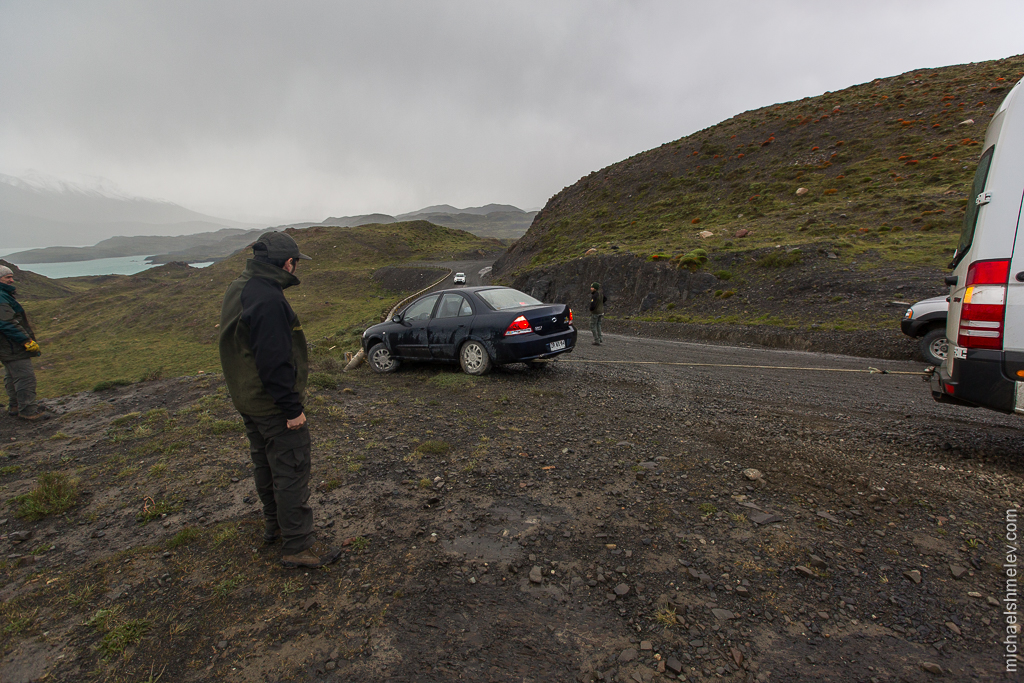 Увидев эту картину, я сразу понял, что всему виной суровый патагонский ветер. Характер этой стихии в «Ревущих сороковых» широтах действительно непредсказуем и вероломен. Порывы могут достигать 200 км/ч, появляться внезапно и так же исчезать. Жертвой такого порыва и стал водитель этого автомобиля, не справившийся с управлением на каменистом грейдере.