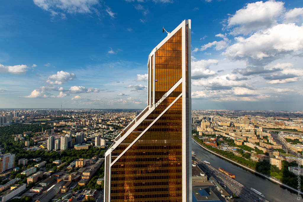 На минувшей неделе по приглашению Департамента градостроительной политики Москвы мы побывали на 80 этаже строящейся башни Федерации. Во время часовой пробежки по этажам и подъемов на технических лифтах удалось сделать несколько высотных кадров и панорам. Съемка велась преимущественно с 73-75 этажей, так как этажи выше закрыты строительной сеткой и ветрозащитными экранами.