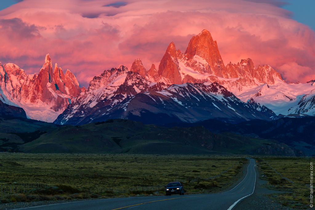 Удивительно, но в окрестностях деревушки El Chalten – треккинговой мекки национального парка Los Glaciares, над бесконечными ледовыми полями властвуют сразу две совершенно не похожие друг на друга вершины. Первую – Фицрой – я уже показывал, но вторая постоянно скрывалась под сенью тяжелых облаков несмотря на то, что расположена всего в четырех километрах западнее «Дымящей горы». Лишь спустя две недели мне удалось увидеть ее чистой.