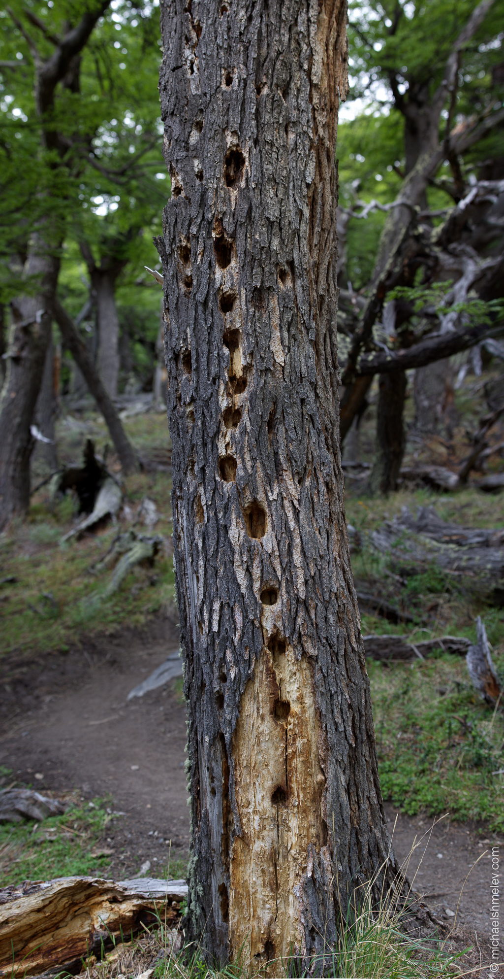 Поговорим немного о фауне Патагонии. Тук-тук-тук! Королевский магелланов дятел. Осознавая свою августейшую избранность среди прочих дятлов, эта особь с необыкновенным исступлением дырявит лес, нарезая дупла по нескольку штук в одном стволе. Когда королевский магелланов дятел долбит дерево с частотой не менее трёхсот герц, от одного этого вида у зрителя может закружиться голова. Если дятел замолк и не долбит, значит, он осматривается, ищет новое дерево. Тук-тук-тук!