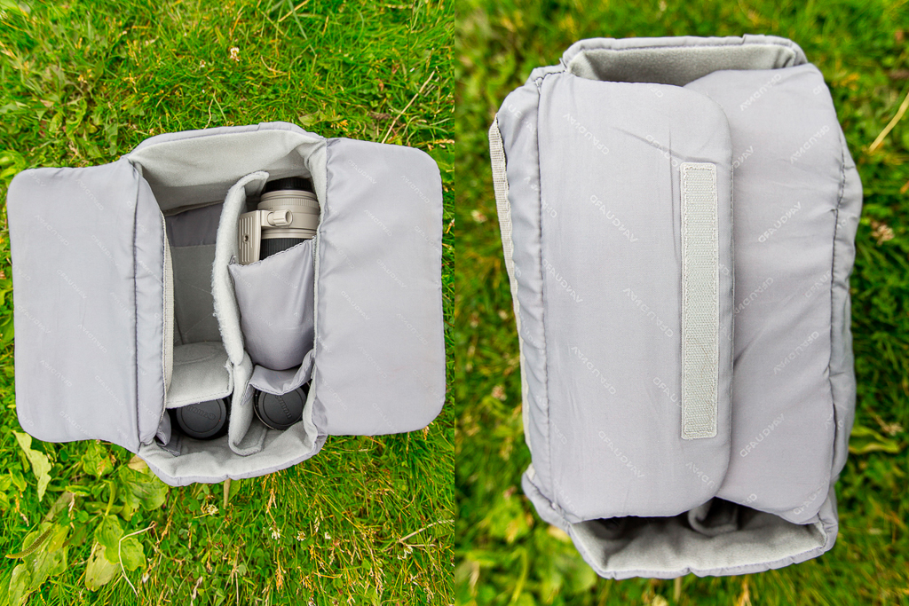 Так вот, поддон с 2-мя большими отделениями и двумя маленькими, в которых можно расположить зеркалку со штатником, телевик и пару объективов, впритык входит в Speedlite 20, после чего рюкзак застёгивается на молнии, стягивается боковыми утяжками и приобретает в итоге очень прочную, трудновскрываемую, неброскую и чрезвычайно лёгкую конструкцию, внутри которой фототехника вполне надёжно защищена. Ровно то, что мне и требуется. На фотографиях выше как раз видно, как выглядит рюкзак с фотоинвентарем.