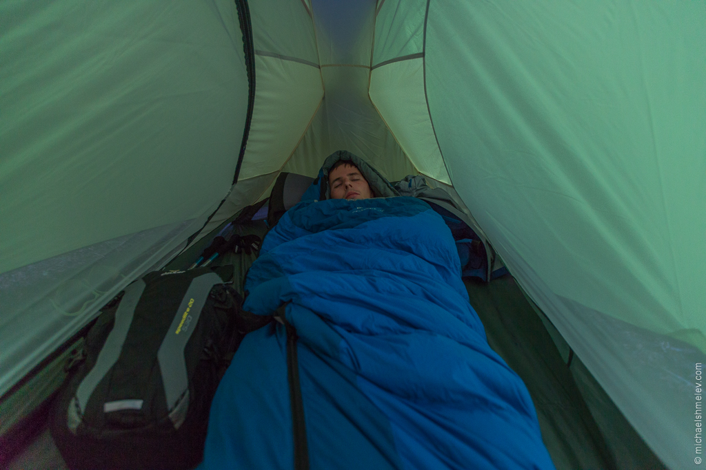 Благодаря форме кокона и обилию регулировок полностью застёгнутый на голове спальник нет нужды снимать, если нужно выйти ночью из палатки: достаточно расстегнуть мешок снизу до половины, освободив ноги, что сэкономит драгоценное тепло. Это еще одна причина, по которой я выбираю коконы, а не классические спальники-одеяла. Для тех, кто утверждает, что коконы тесные, вот еще одна фотография довольного походника: