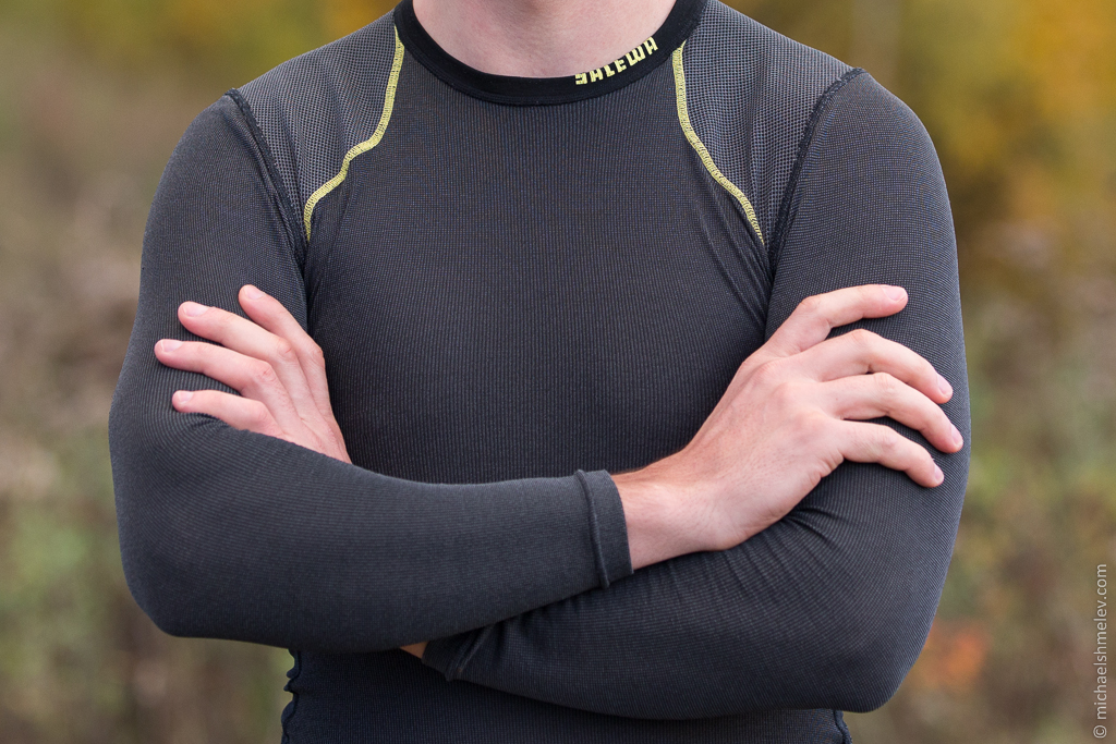 В завершение обзорной статьи, посвященной одежде, я приведу пару примеров экипировки, которые выбрал для себя (см заглавное фото вверху) и прокомментирую критерии выбора. В качестве нижнего слоя я выбрал в тот день одну из трёх имеющихся у меня термофуфаек - Salewa Power Carbon. При умеренной цене в 2тыс рублей имеет неплохие характеристики - материал лёгкий и очень прочный. По спецификации с сайта - якобы имеет в плетении карбоновое волокно. На крупном фото ниже видно, что плетение материала тонкое, плотное, а нить гладкая. На практике это означает, что термушка будет ноской - не будет вытягиваться, не будут образовываться катышки. Всегда внимательно присматривайтесь к таким нюансам.