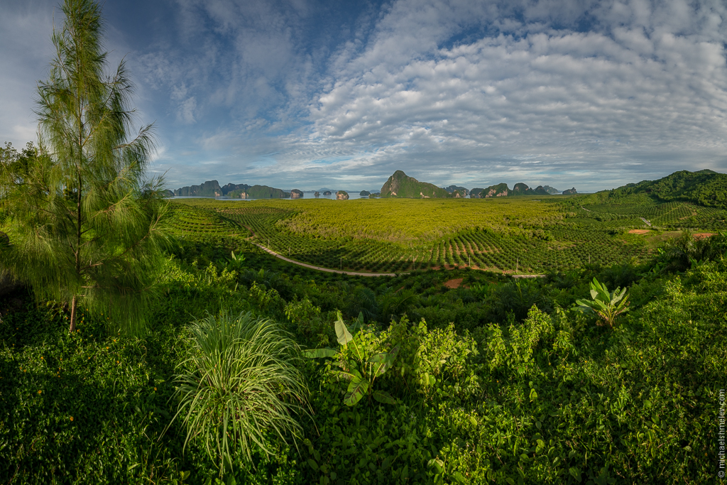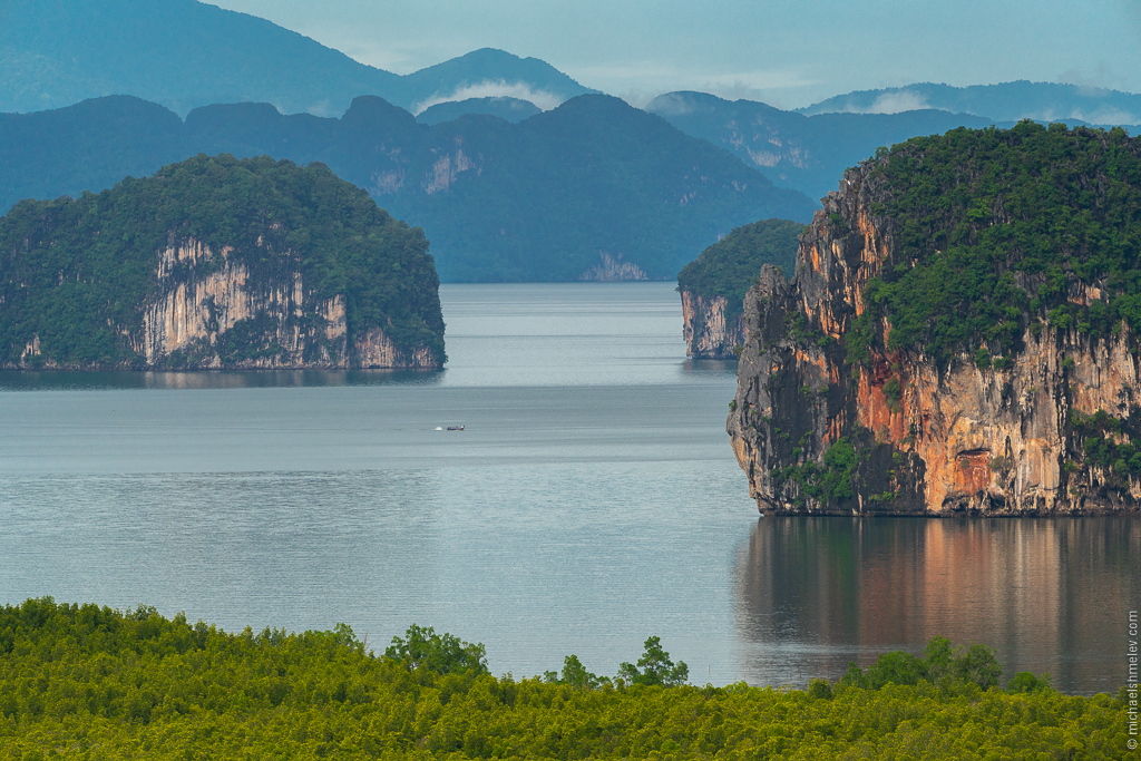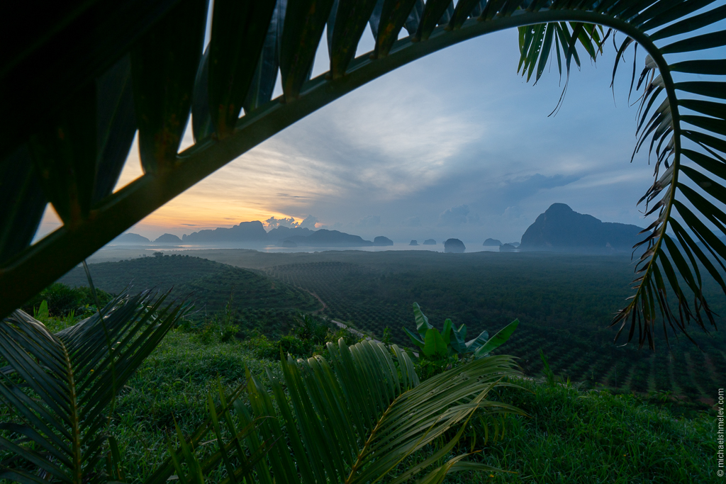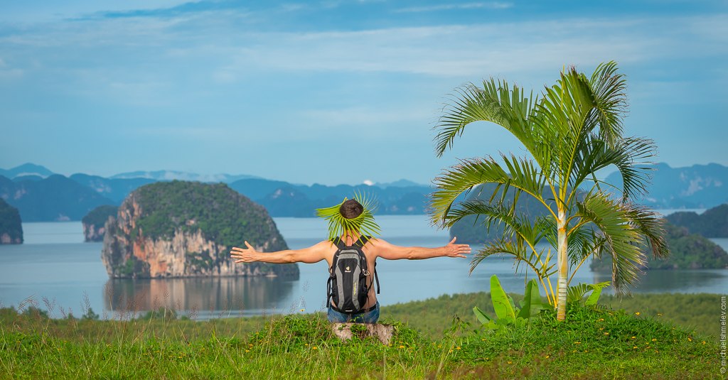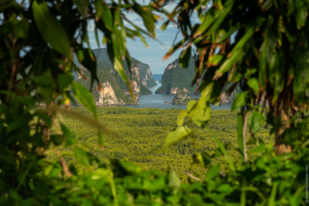 Огибая очередной холм, туда убегала извилистая тропа, буйно поросшая зеленью. Иногда сквозь листву удавалось оценить виды, но настоящее открытие ждало нас возле самой вершины, когда сквозь листву окрылся панорамный вид на известковые острова залива Пханг-Нга. Когда я увидел этот пейзаж, то буквально окаменел от восторга: так живо эта картина напомнила мне сцену из приключенческих книг моего детства.