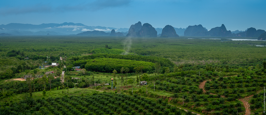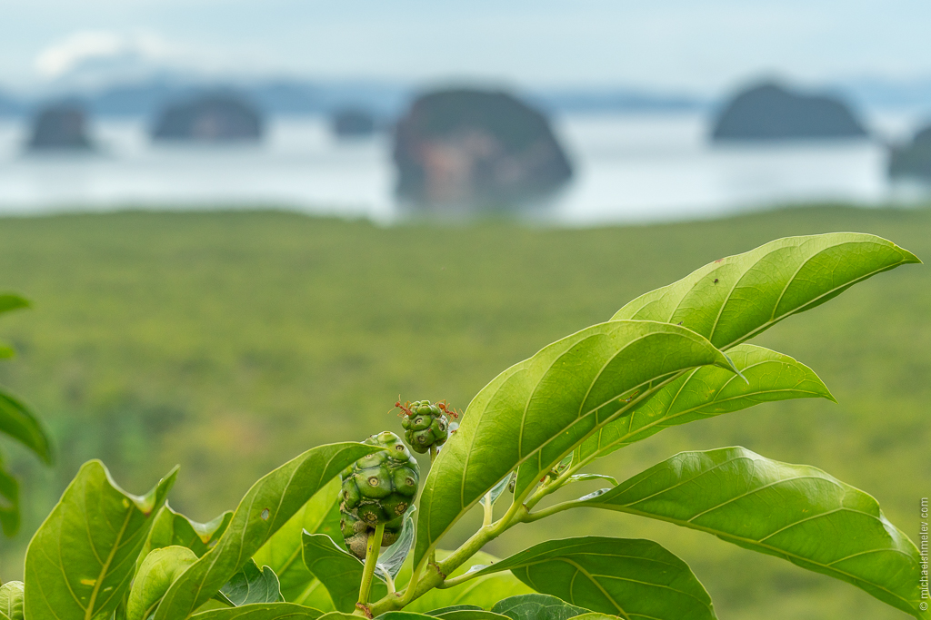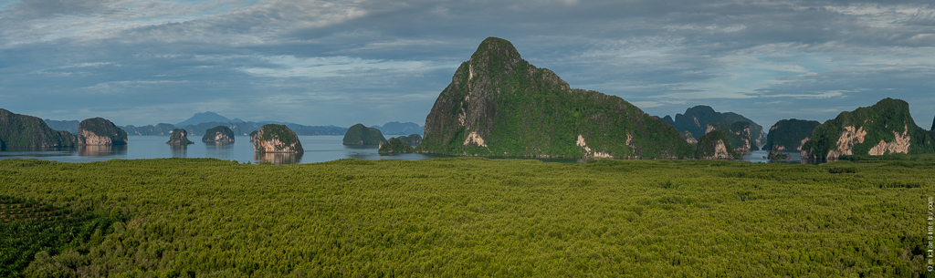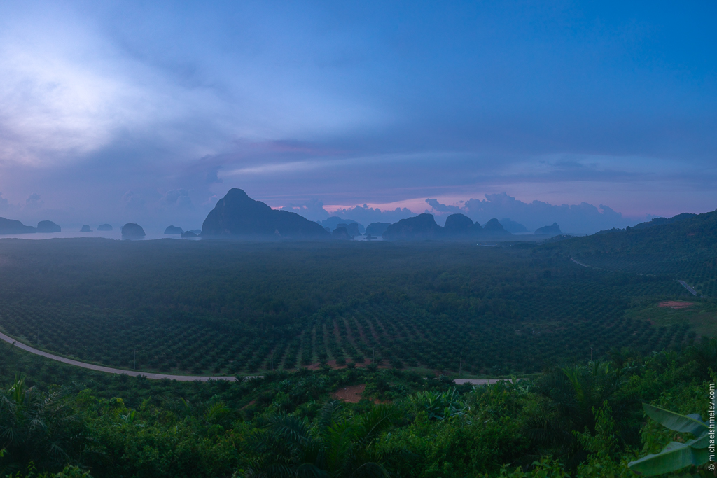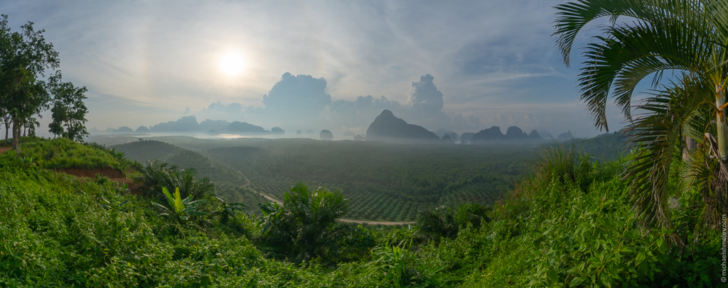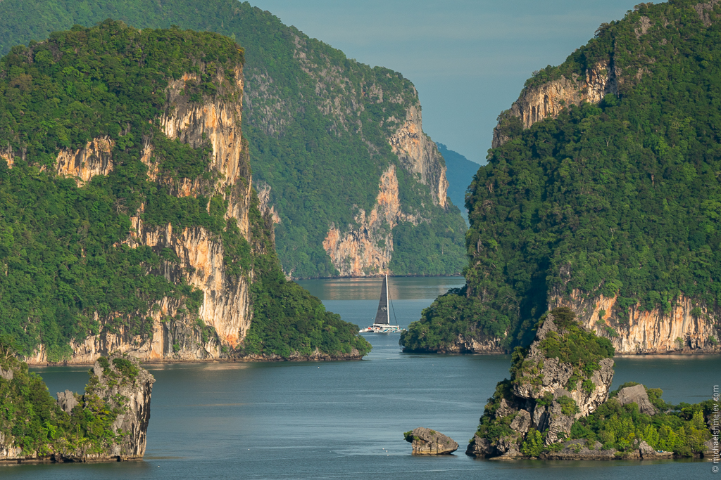 Огибая очередной холм, туда убегала извилистая тропа, буйно поросшая зеленью. Иногда сквозь листву удавалось оценить виды, но настоящее открытие ждало нас возле самой вершины, когда сквозь листву окрылся панорамный вид на известковые острова залива Пханг-Нга. Когда я увидел этот пейзаж, то буквально окаменел от восторга: так живо эта картина напомнила мне сцену из приключенческих книг моего детства.