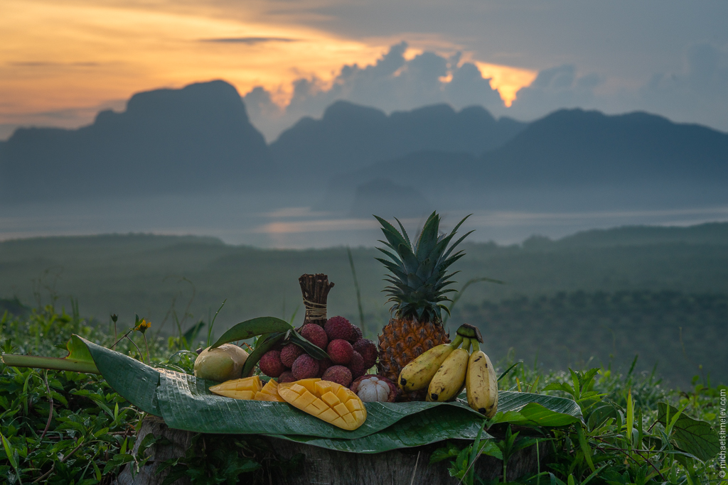 Накануне нашей перанаканской свадьбы мы решили отблагодарить богов природы за их щедрые дары: бархатную погоду, жаркое солнце, незабываемые рассветы и закаты и обилие безумно вкусных фруктов - всё то, чем столь богаты эти райские земли. К выбору подходящего места отнеслись ответственно: в первую очередь нам хотелось, чтобы это было относительно труднодоступная точка на карте, где-то на вершине горы. Безлюдная, чтобы поблизости не было никого кроме нас. Выбор пал на окрестности национального парка Phang-Nga в одноименной провинции. Там мы и гуляли целый день, изучая тропы, поднимаясь на живописные холмы пока, наконец, не нашли идеальное место.